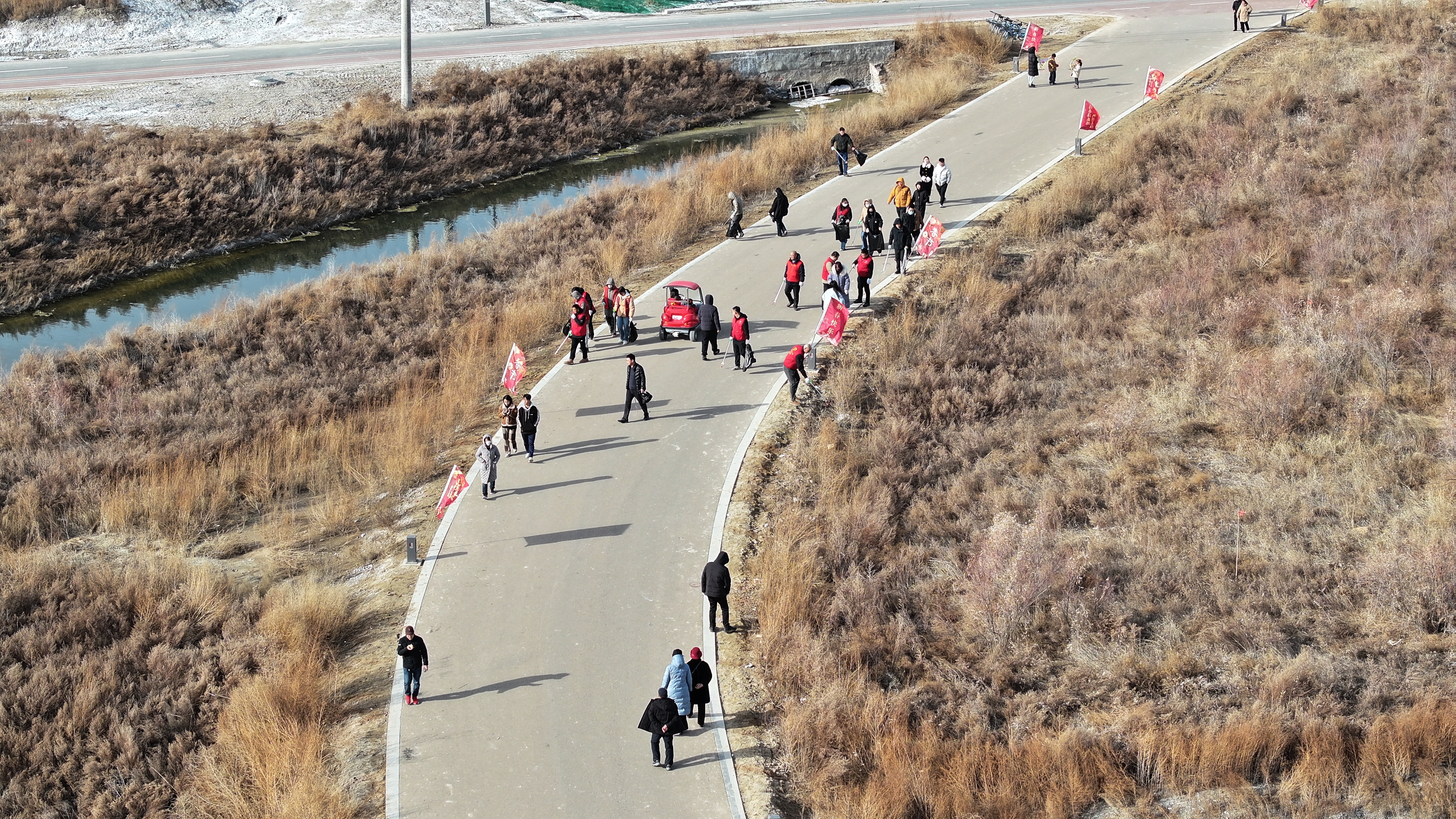 活動(dòng)中,黨員同志們身穿紅馬甲,分工明確、密切配合,按照事先劃分區(qū)域開展行動(dòng)。大家手持垃圾鉗、垃圾袋等工具,圍繞鹽湖22號(hào)堤埝、濕地公園、11-1號(hào)路等范圍,深入堤埝兩側(cè)、蘆葦叢等對(duì)煙頭、塑料瓶、泡沫、果皮紙屑等垃圾進(jìn)行撿拾清理,共清理清運(yùn)垃圾60余袋,在大家齊心協(xié)力下鹽湖周邊衛(wèi)生環(huán)境得到明顯改善。