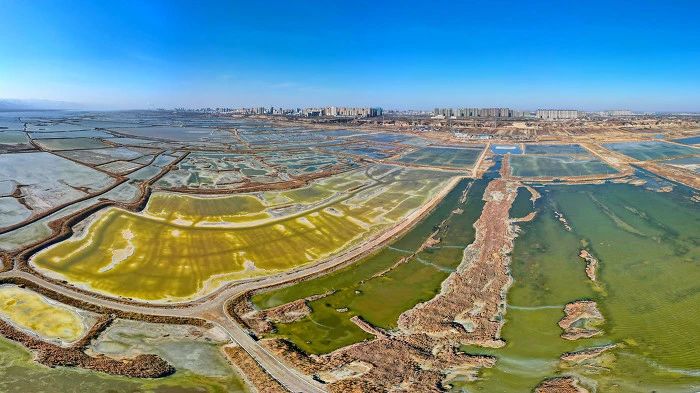 運城鹽湖是世界三大硫酸鈉型內(nèi)陸鹽湖之一,總面積約132平方公里,形狀宛如一條玉帶,蜿蜒在中條山下。鹽湖中的藻類和鹽水蟲繁殖,造成湖水變幻出各種顏色,七彩兼?zhèn)洌鹑缫粋€巨型調(diào)色盤,各色顏料飽滿流溢、異彩紛呈。