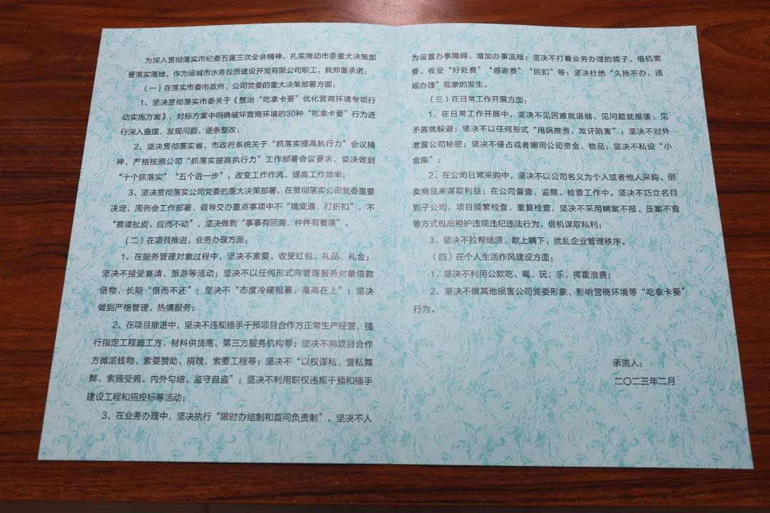 會上,公司黨委委員、紀(jì)委書記王望寬宣讀了市水投公司《整治“吃拿卡要”優(yōu)化營商環(huán)境專項行動實施方案》。根據(jù)此次專項行動提出的30種“吃拿卡要”行為,結(jié)合公司實際,從落實市委市政府、公司黨委的重大決策部署方面;項目推進(jìn)、業(yè)務(wù)辦理方面;日常工作開展方面;個人生活作風(fēng)建設(shè)方面,制作了水投公司整治“吃拿卡要”優(yōu)化營商環(huán)境專項行動承諾書。